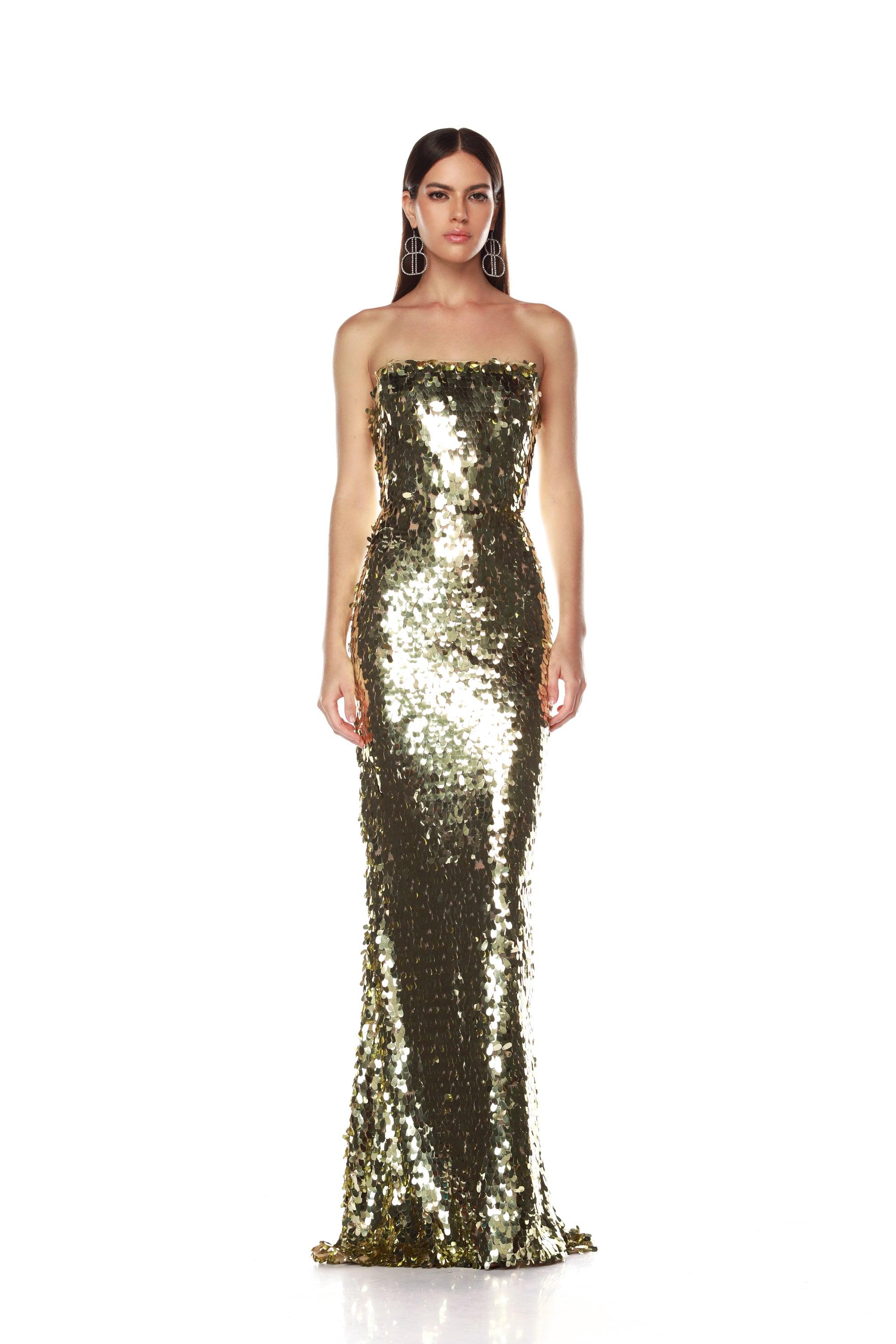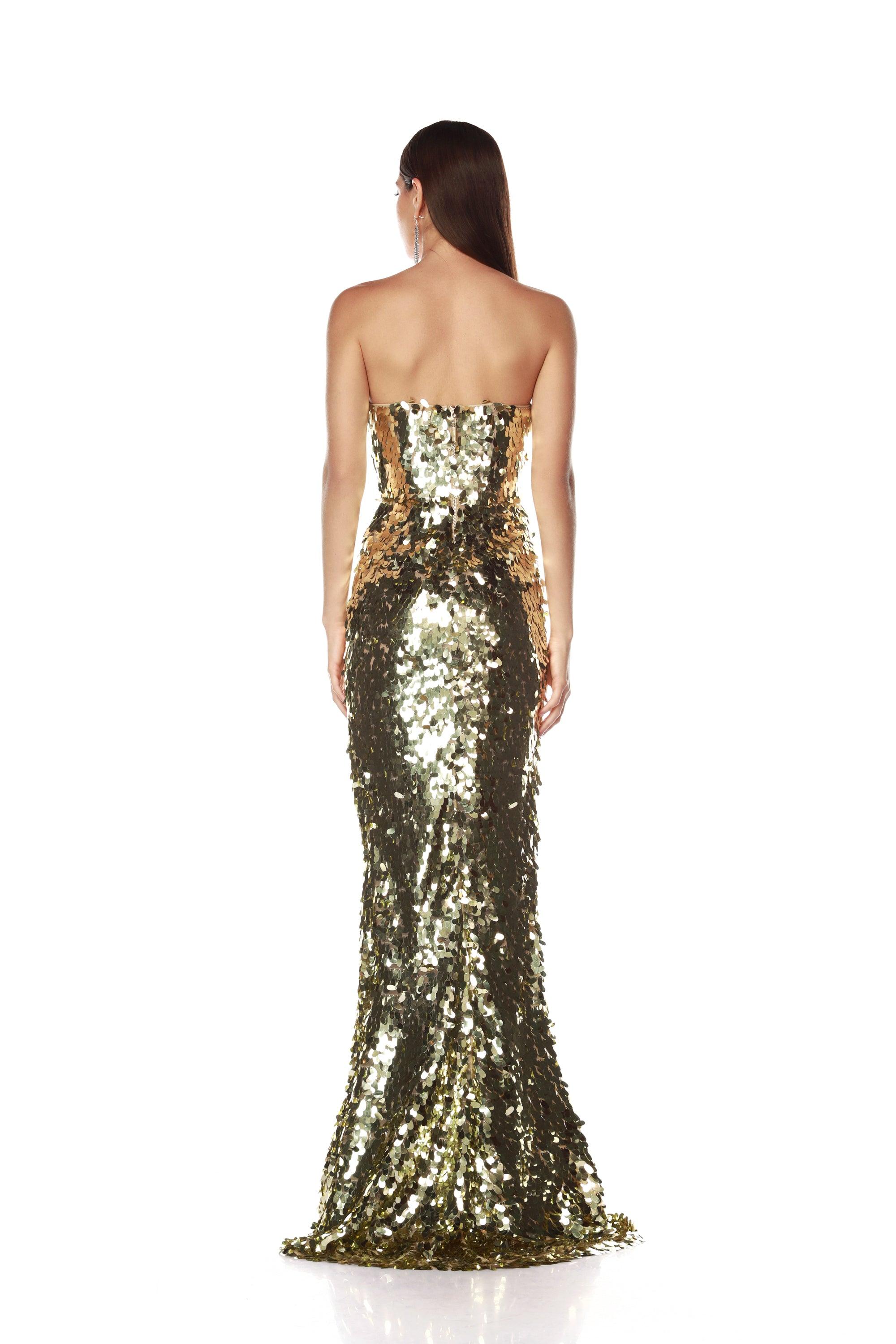 Dazzle in our Farah Gold Sequin Strapless Gown, the epitome of glamour and sophistication.