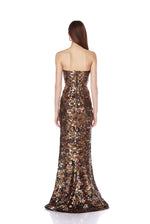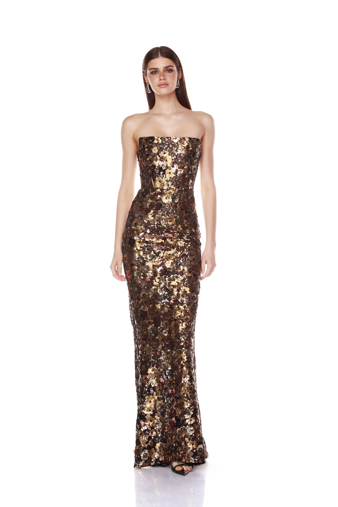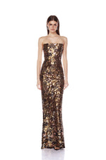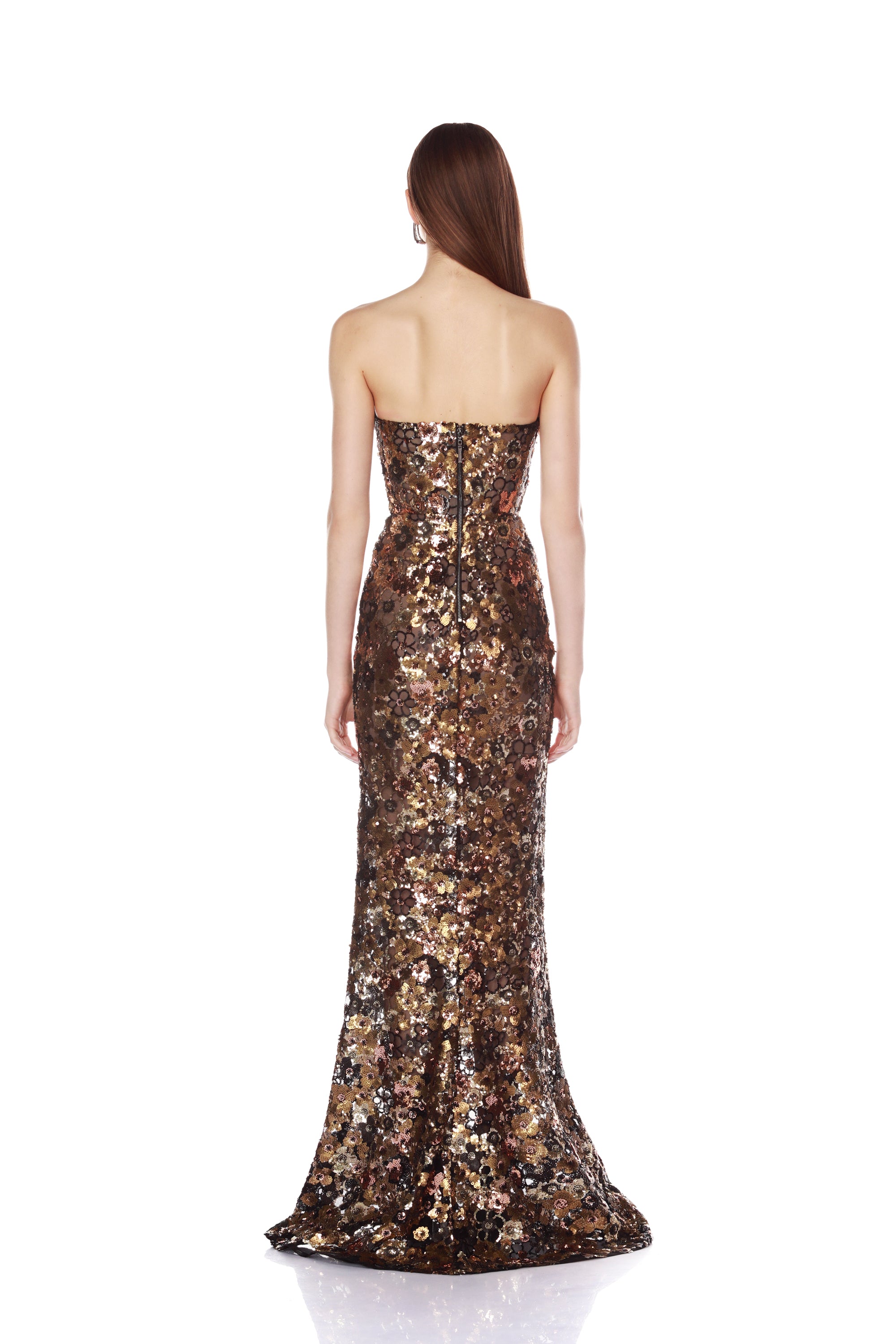 Dazzle in our Farah Gold Multi Sequin Strapless Gown, the epitome of glamour and sophistication.