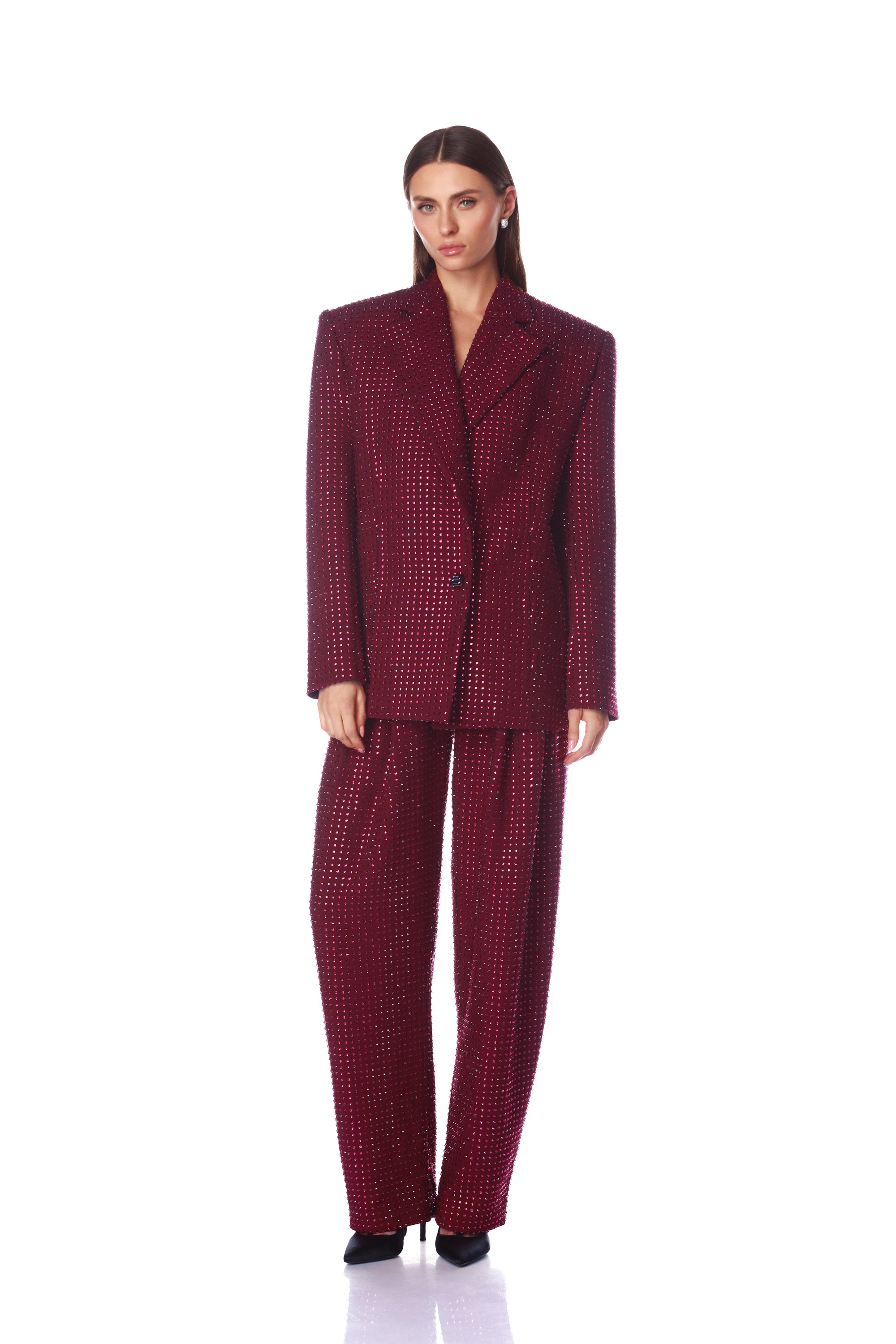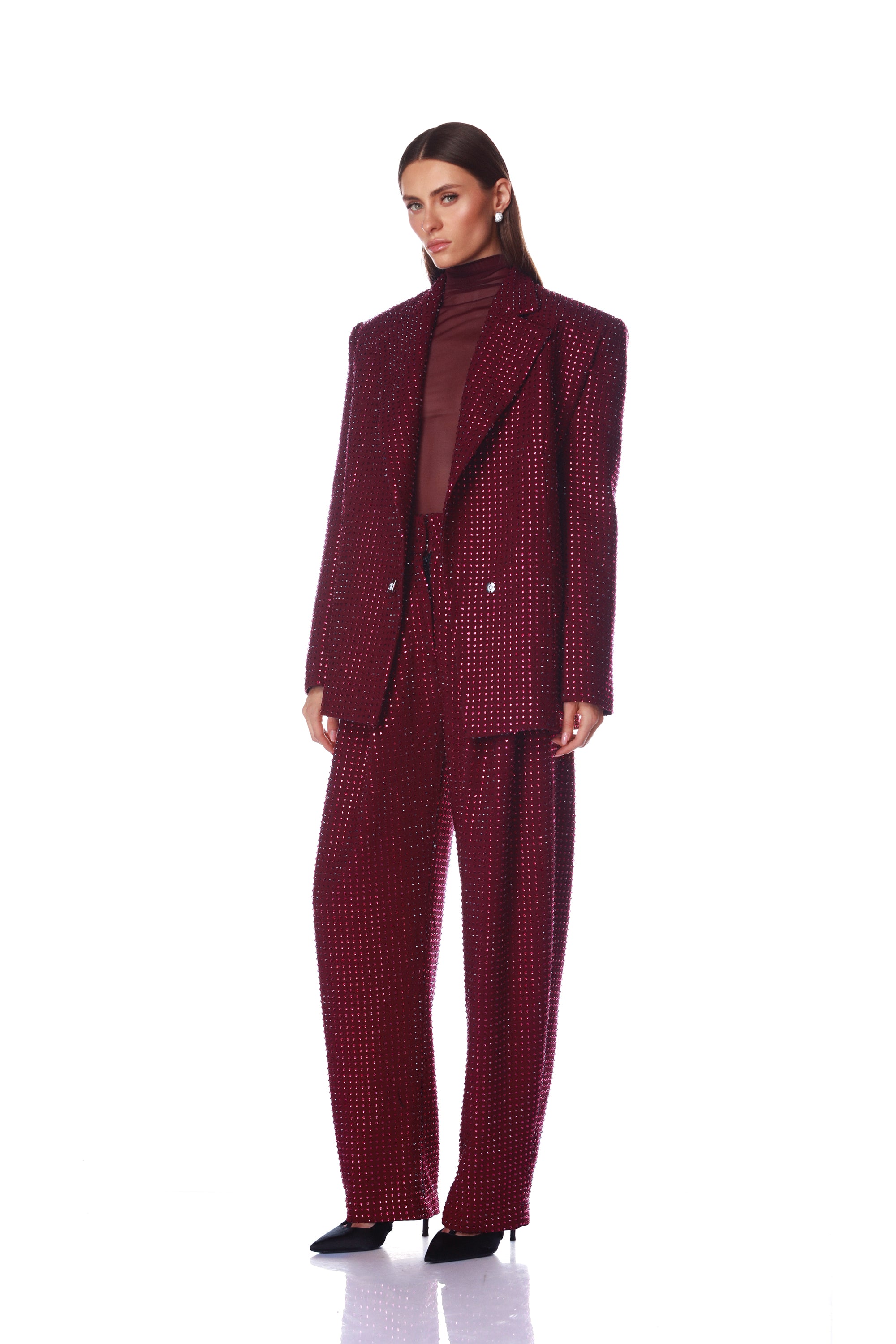 Serve bold glamour in the Blake Burgundy Rhinestone Blazer this holiday season.