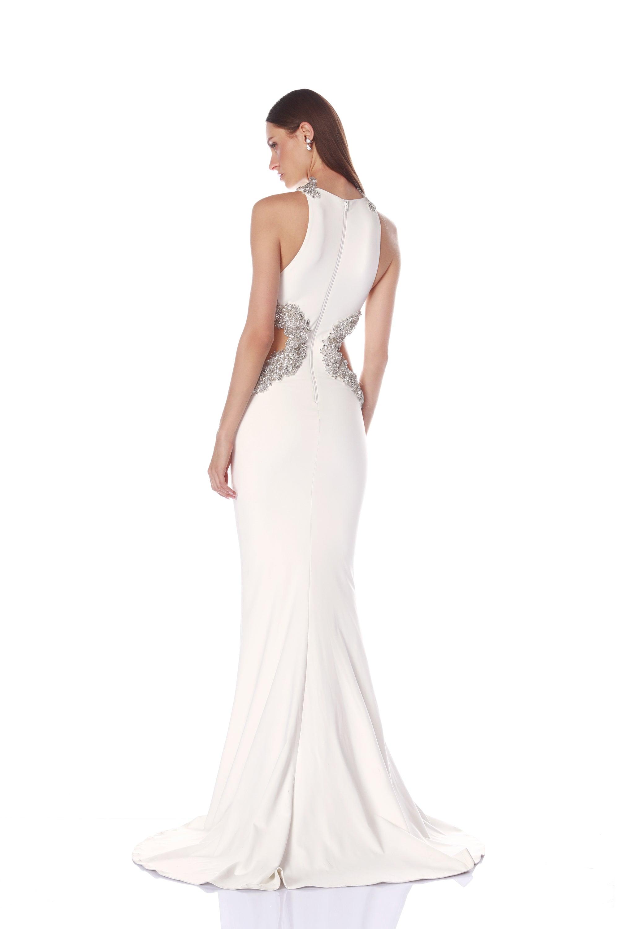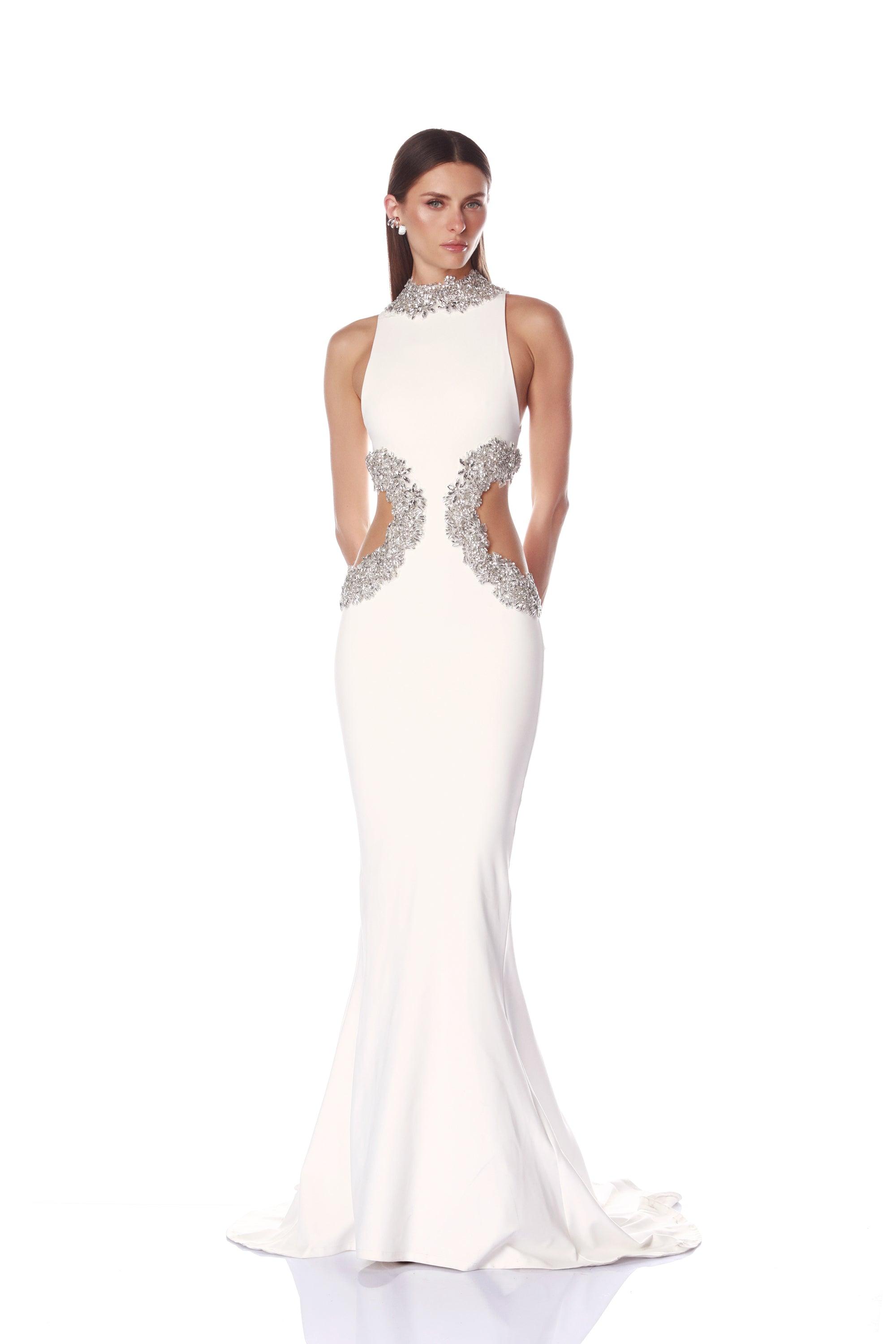 Shine bright in our Camila White Rhinestone Cutout Gown, featuring eye-catching cutouts and sparkling details that make every moment memorable.