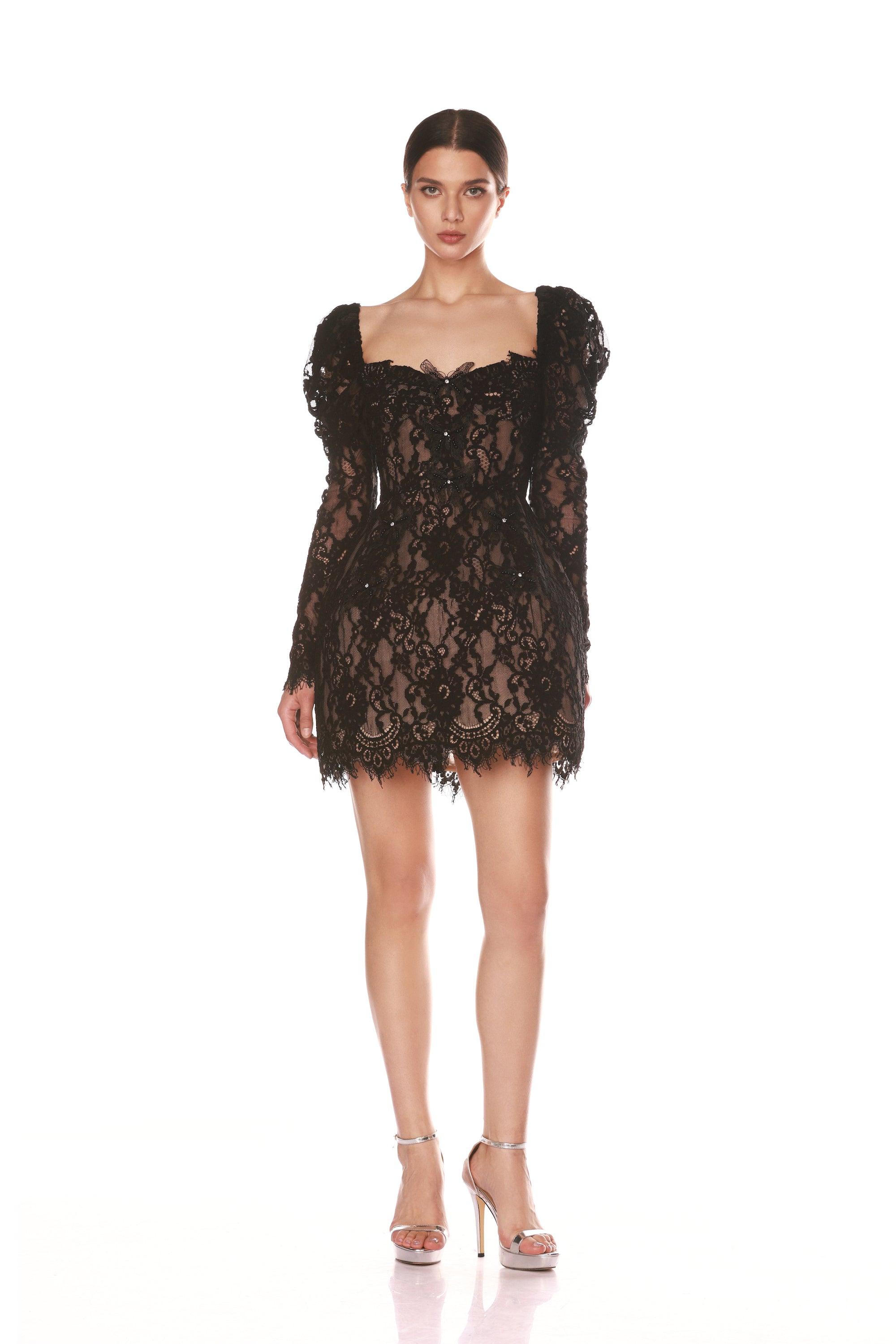 Embrace feminine grace in our Colette Noir Lace Long Sleeve Mini Dress.