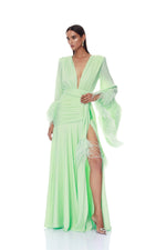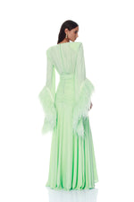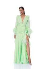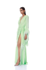 Drape yourself in opulence with our Geisha Mint Maxi Dress, adorned with luxurious ostrich feather.