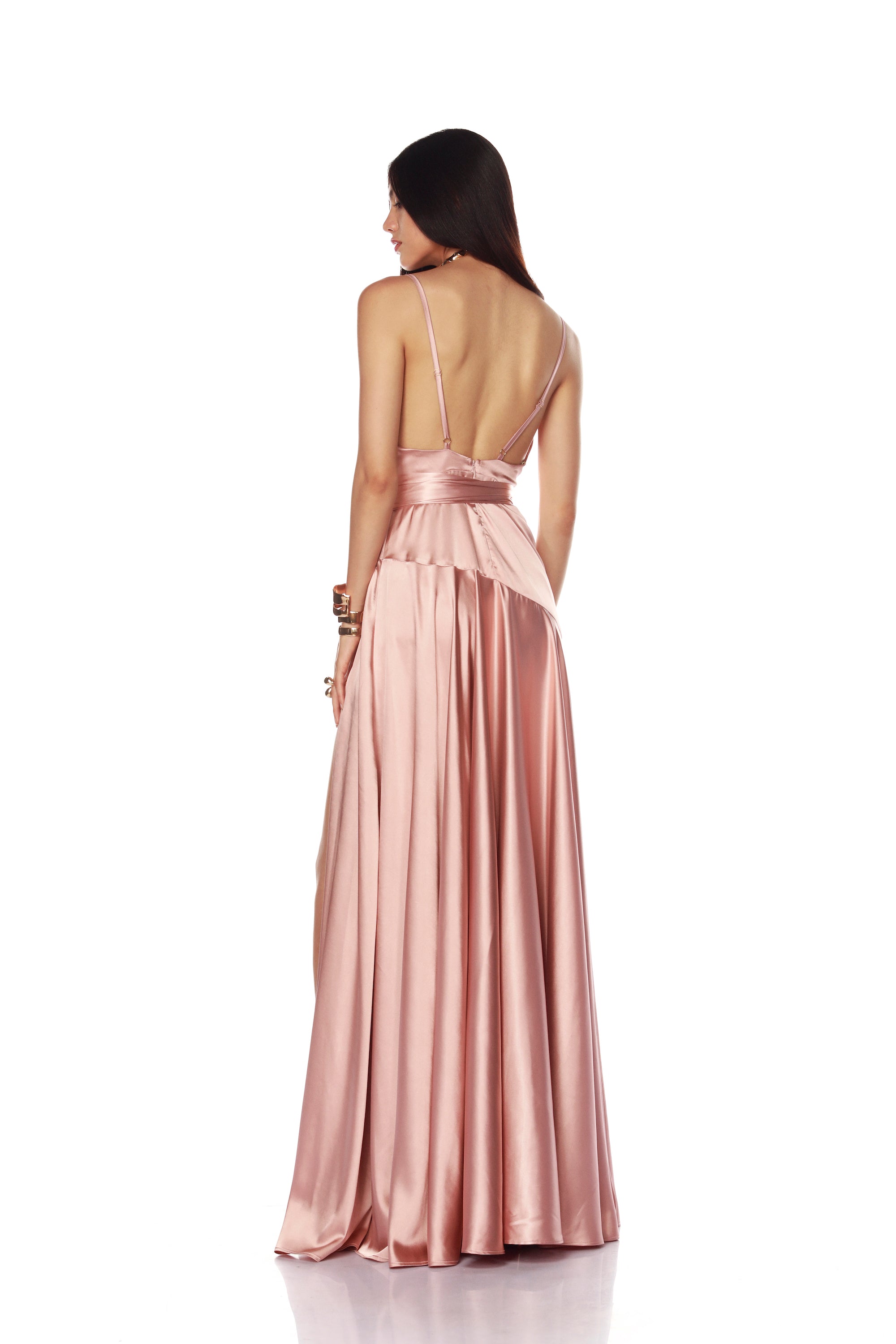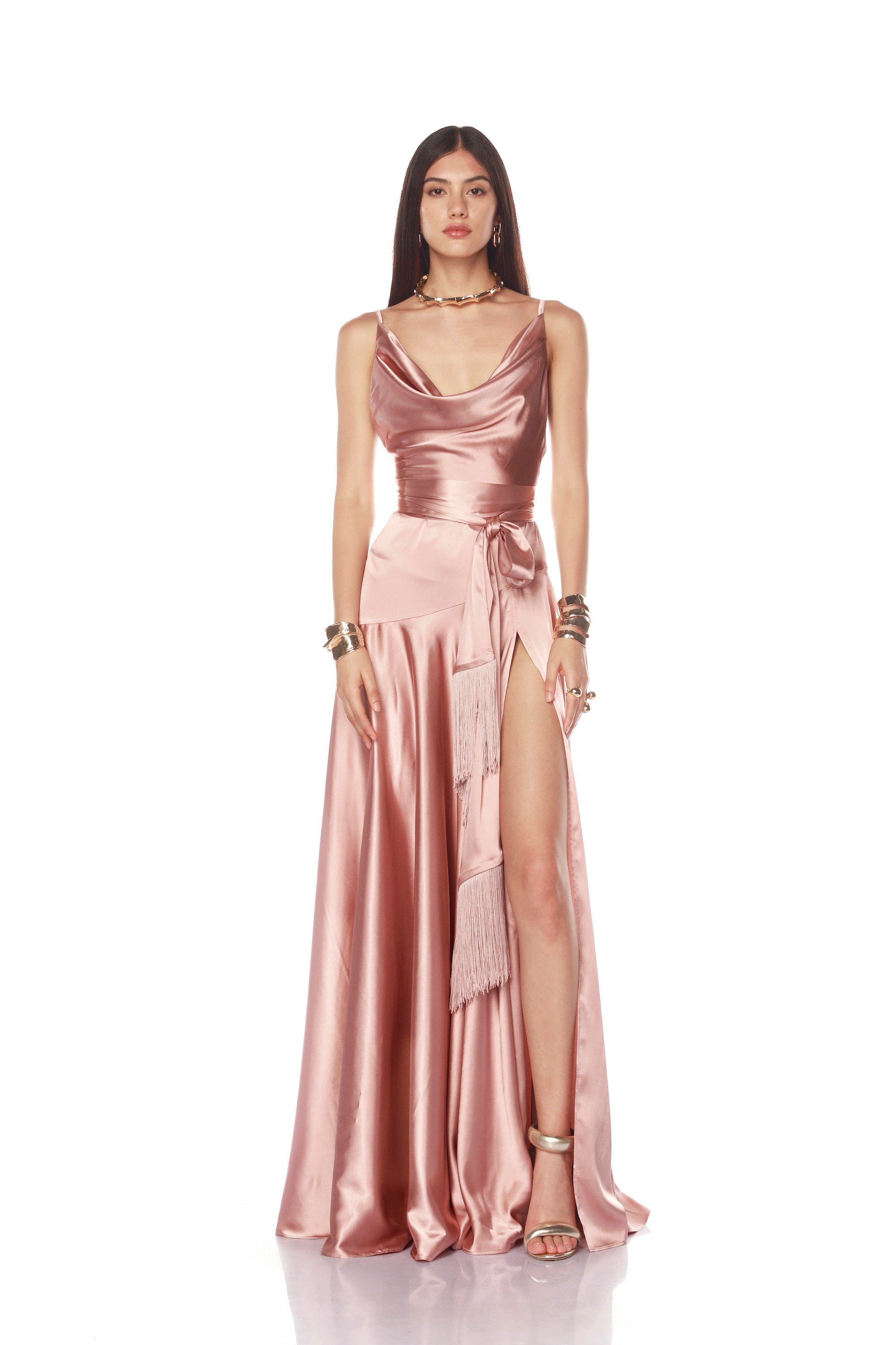Radiate elegance in our Leo Peach Gown, a stunning piece that combines soft hues with a flowing silhouette for a romantic look.