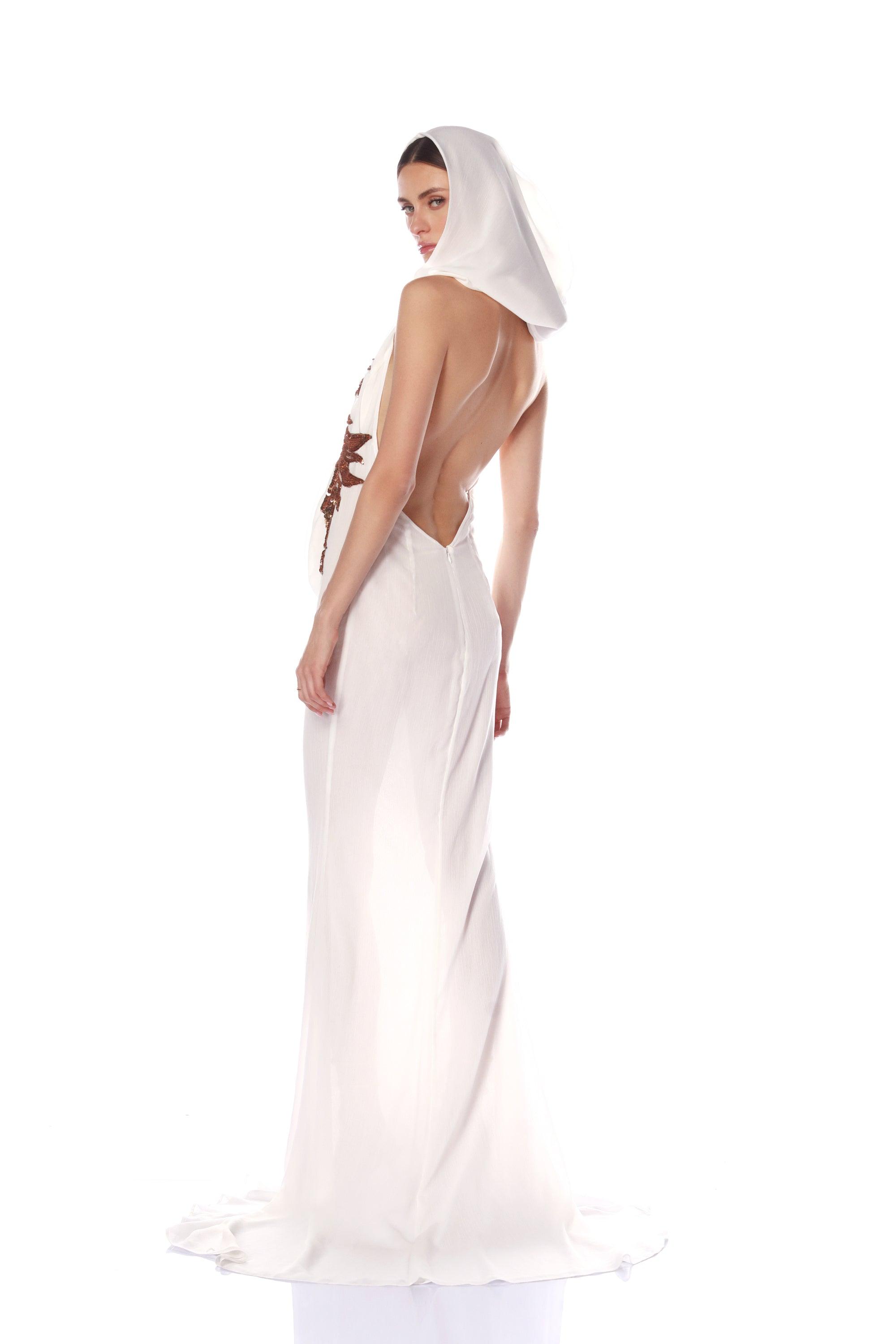 Stun in the Noemie White Dress with a plunging cowl neck and unique dragon design that creates a look both fierce and elegant.