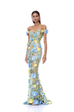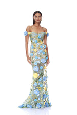 Portofino Floral Jasmine Off the Shoulder Blue Multi Gown
