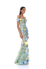 Experience timeless elegance with our Portofino Floral Jasmine Off the Shoulder Gown, featuring a sweetheart neckline adorned with delicate 3D floral appliqués and a dreamy baby blue hue.