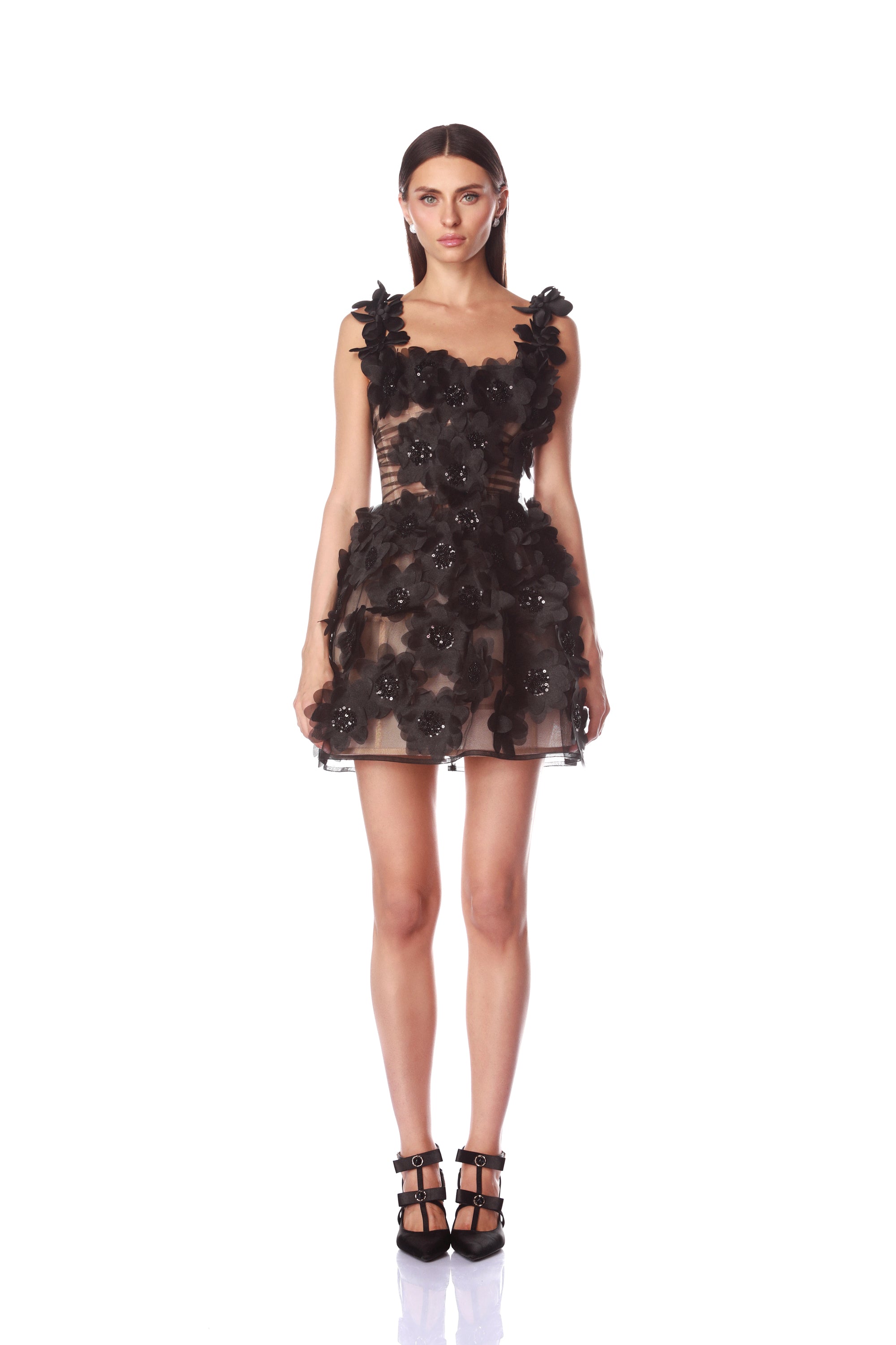 - Adorned with sequin-embellished tulle floral appliqués