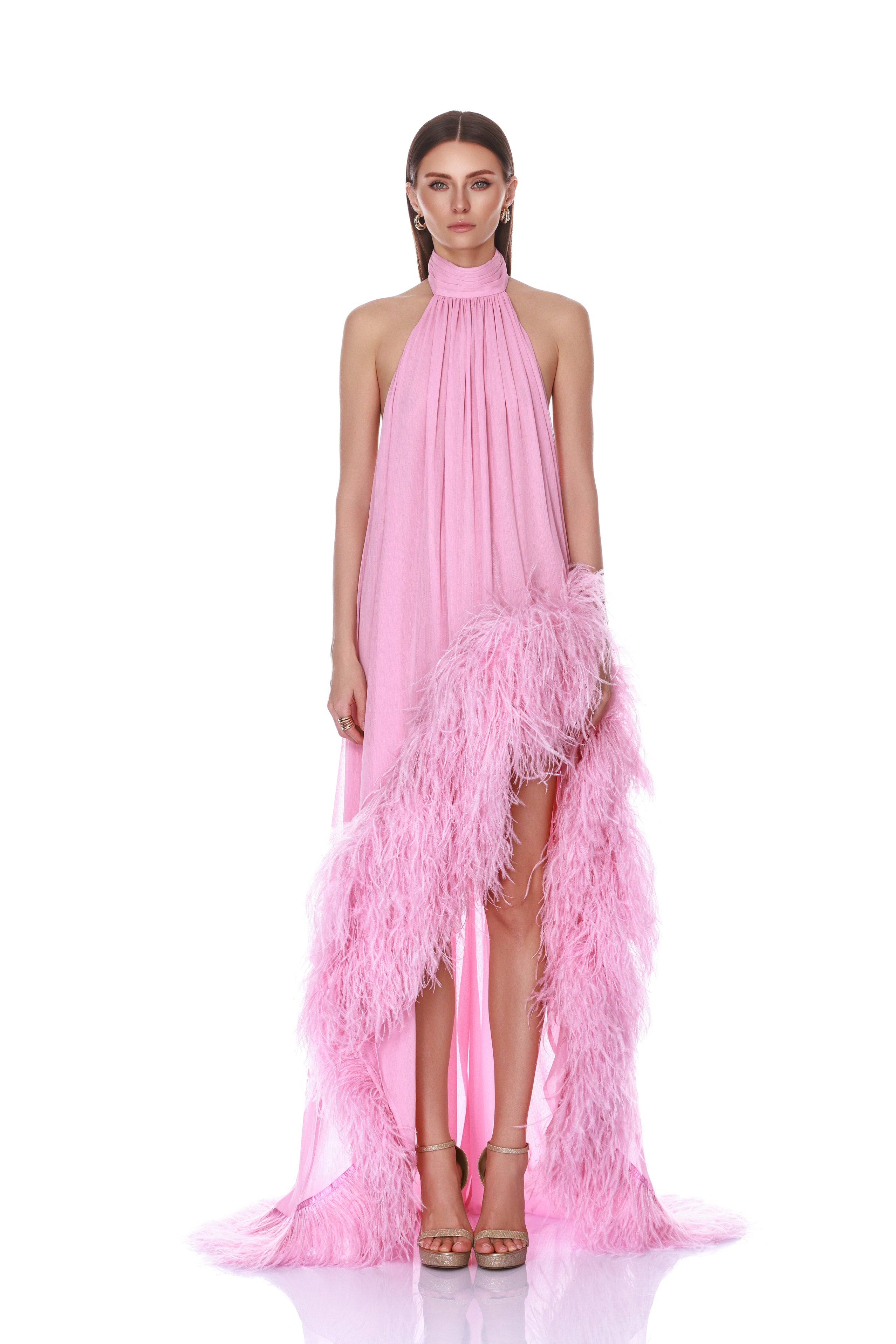 Drape yourself in opulence with our Madeline Halterneck Gown in baby pink.
