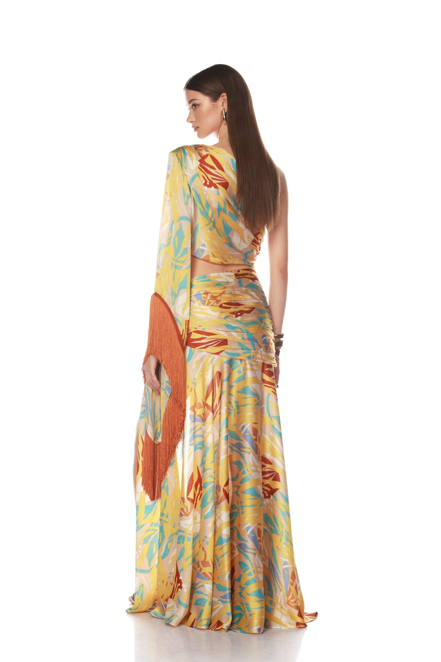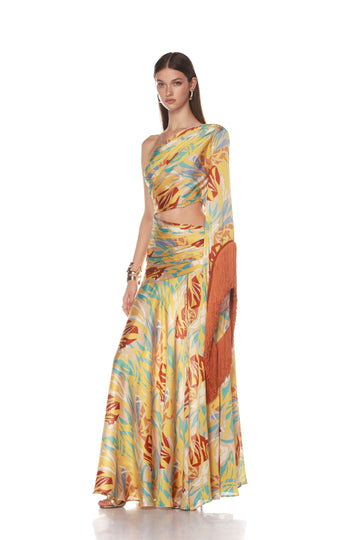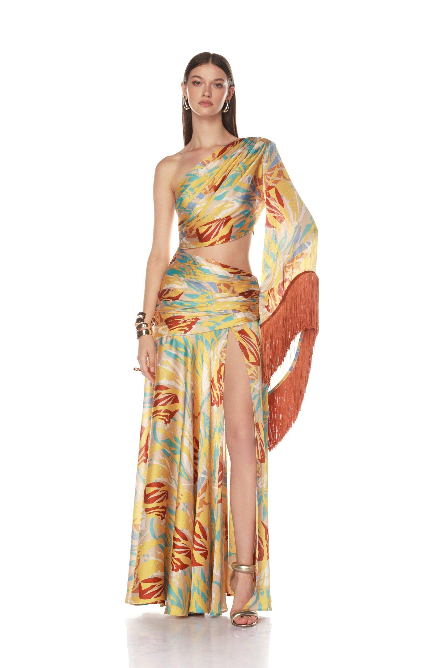 Make a statement in our Jafari Isla Fringe One Sleeve Gown, where bold fringe details and a chic silhouette create a stunning and unforgettable look.