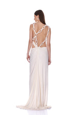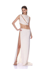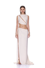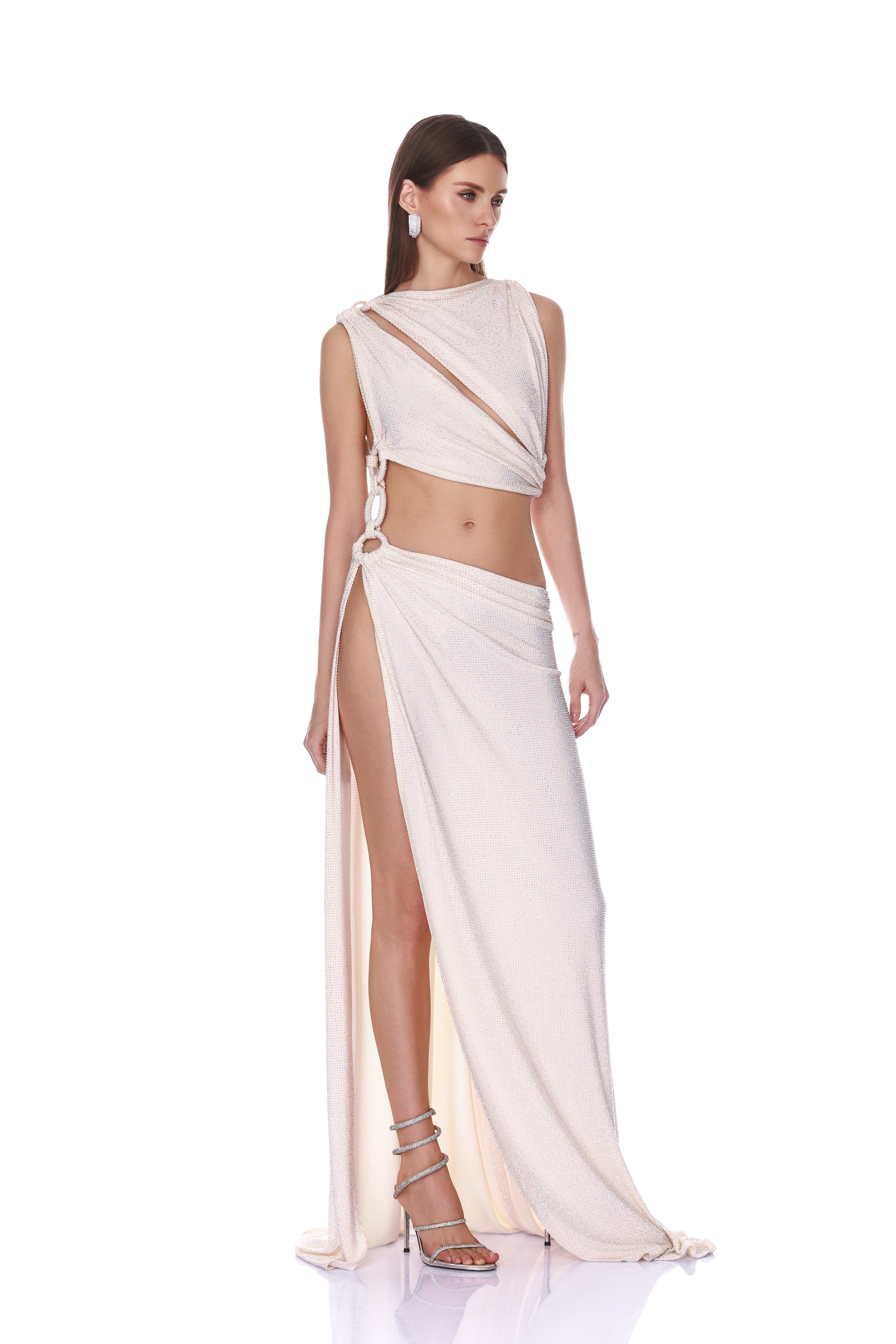 Asymmetrically draped gown with waist cutout and high-leg slit skirt in shimmer jersey fabric.