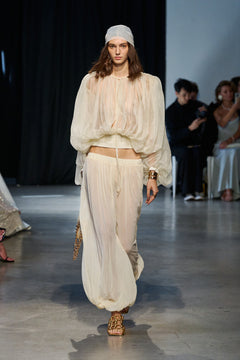 Ivory two-piece set. Sheer long-sleeve blouse and high-waisted ruched pants with flowing silhouette.
