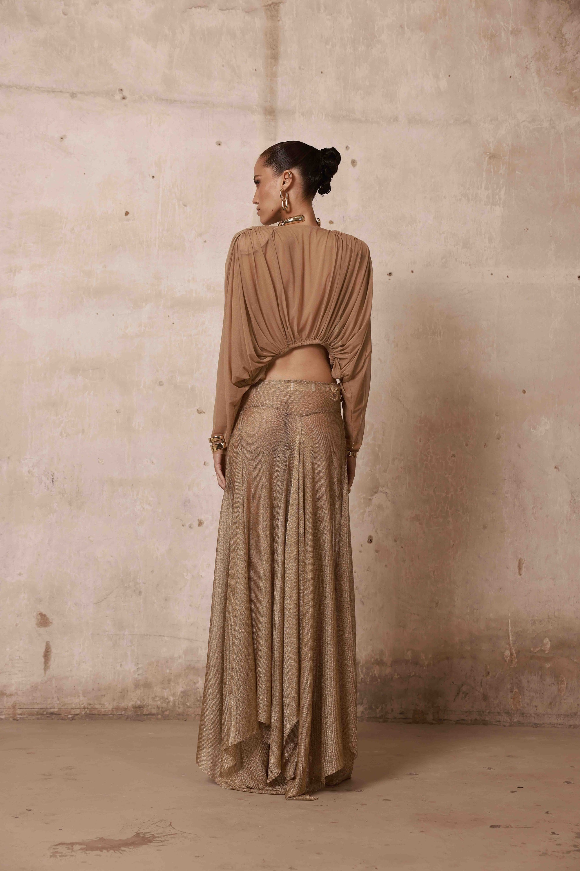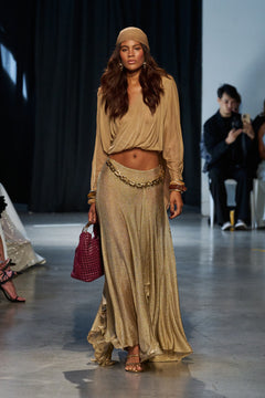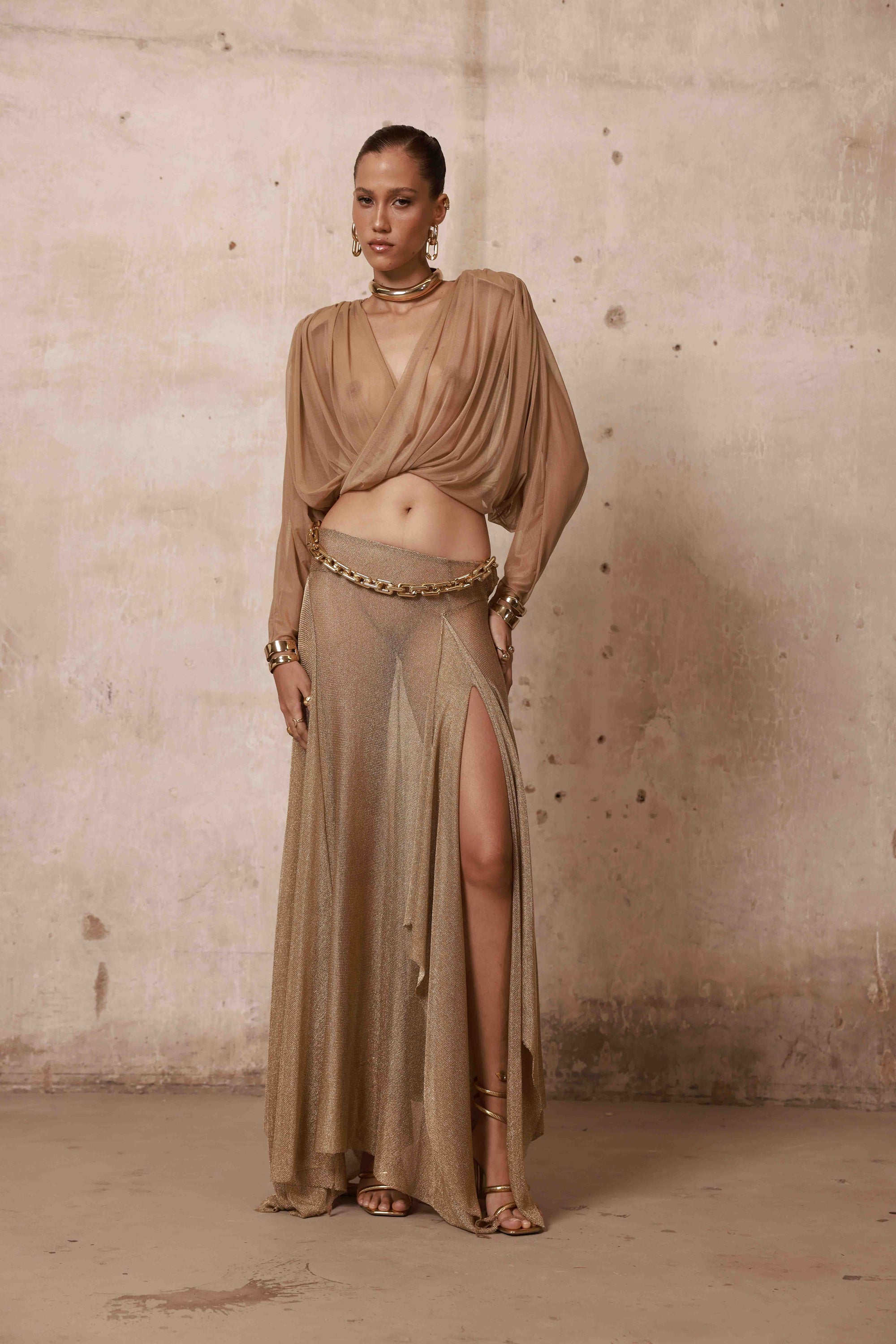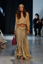 Gold two-piece set, a draped long-sleeve crop top with a gold metallic knitted skirt.