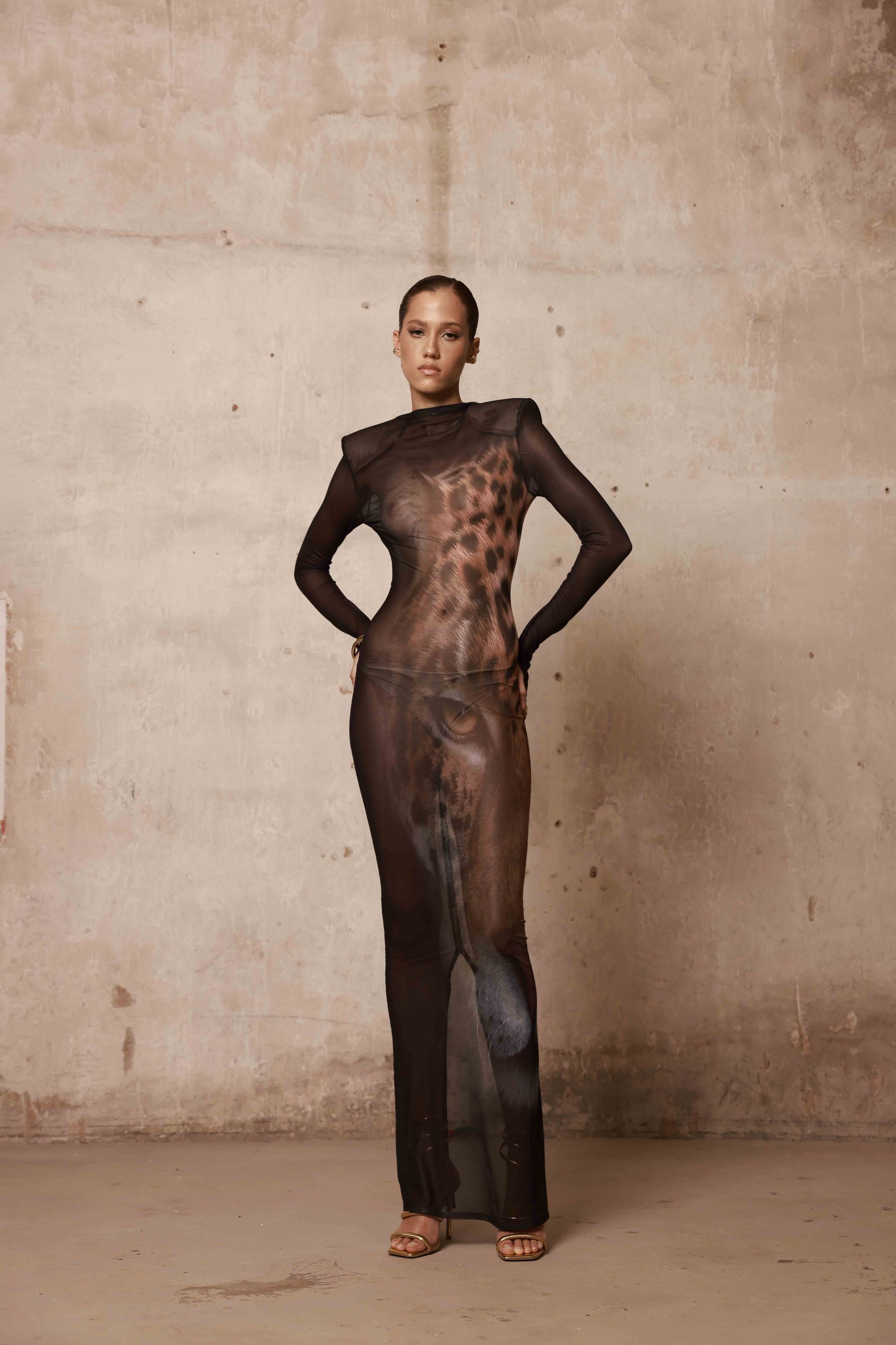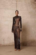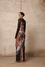 Black long-sleeve sheer gown with high neckline and front leopard face print.