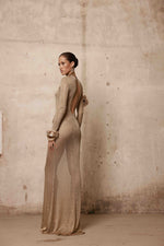 Sheer metallic full-length long sleeve gown, front keyhole cutout, and body-hugging silhouette
