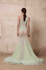 Mint sheer floor-length gown with ostrich featherss at hem and asymmetrical bodysuit layering.