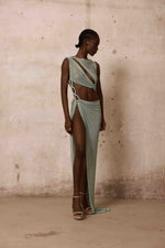 Mint green rhinestone asymmetrical dress with cutout detail and a high-slit floor-length skirt with ring accent.