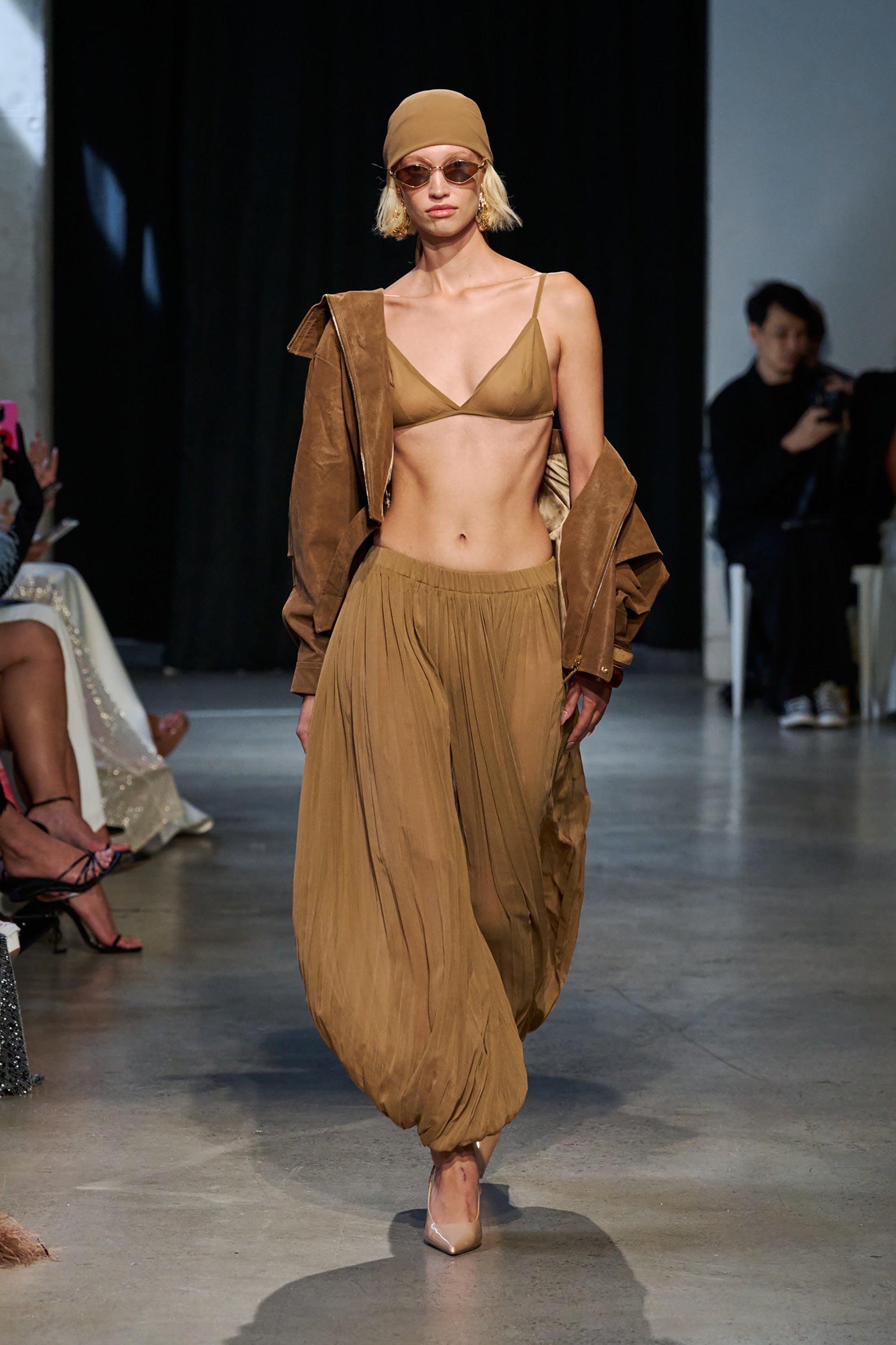 Brown chiffon bralette top with matching draped pants, styled with oversized suede jacket