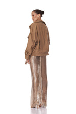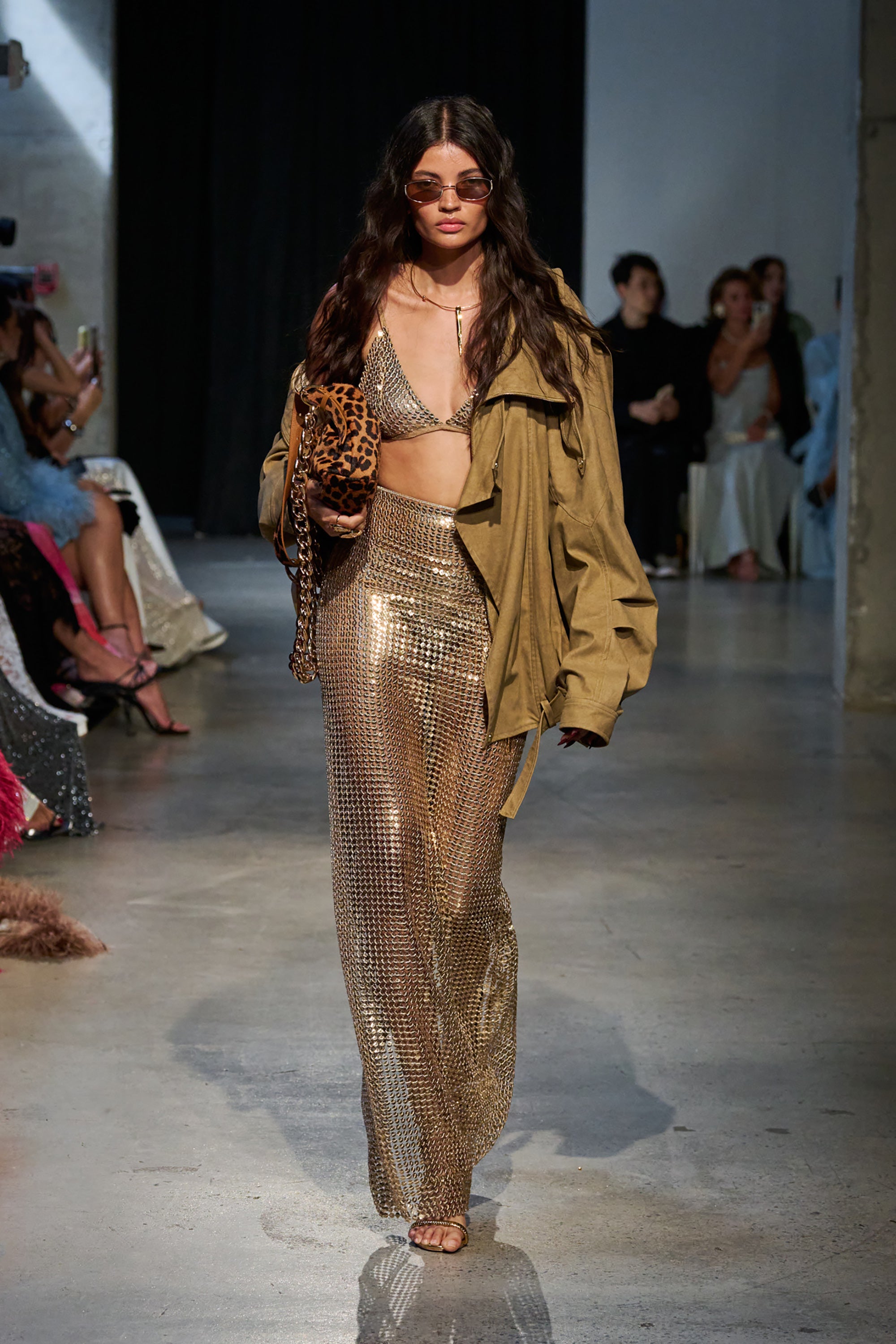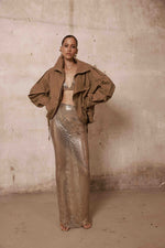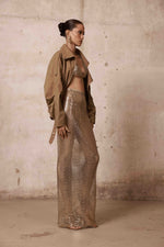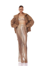 Gold two-piece set with a metallic bra top and sequined maxi skirt, styled with jacket.