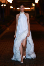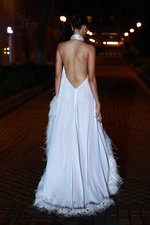 White halter-neck gown with high slit and ostrich feather trim detailing.