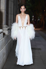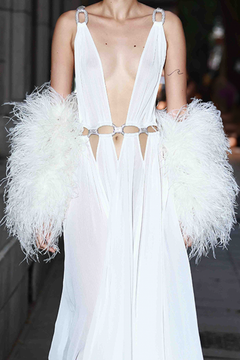 Plunging v-neck gown with multiple cutouts and floor-length draping panels.