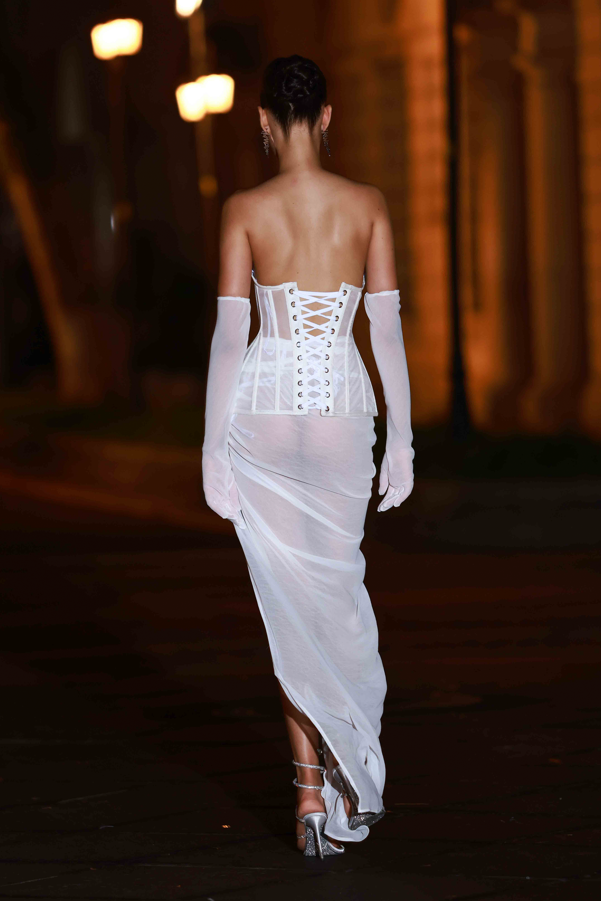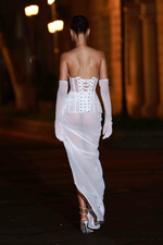 Strapless corseted gown with embellished bodice and draped sheer skirt.