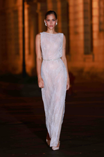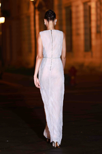 Sleeveless gown with metallic beaded fabric and column silhouette.