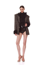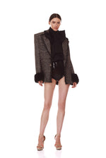 Make a stunning statement in the Kacey Gold Sequin Blazer, finished with luxurious fur-trimmed sleeves.