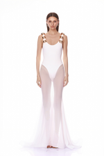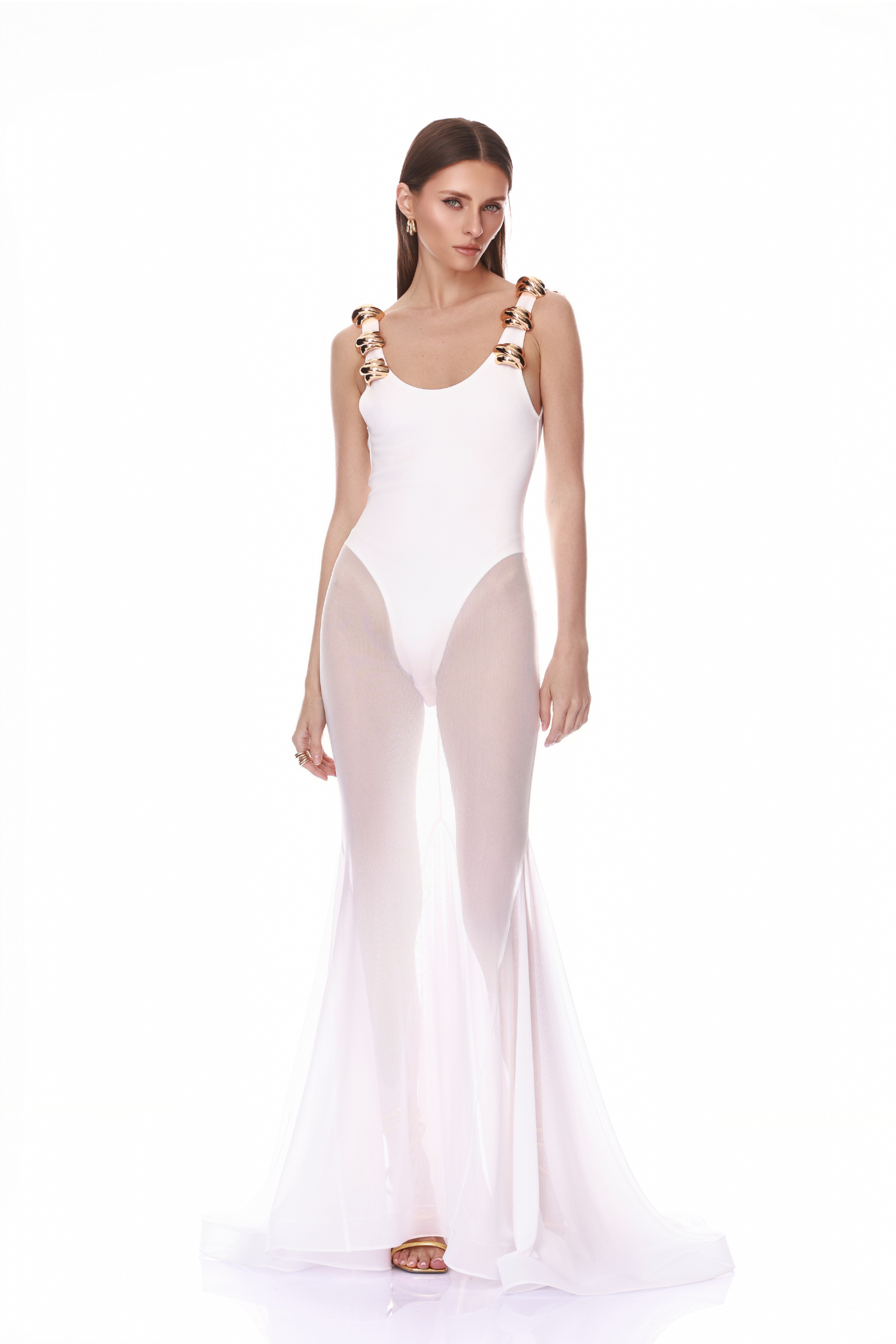 Dazzle in ethereal glamour with our Kaya Blanc Sheer Illusion Metal Gown — a show‑stopping silhouette designed to captivate from every angle.