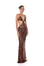Brown piette floor-length gown with symetrical cutouts on side of the waist.