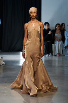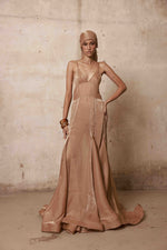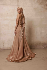 Gold sheer gown featuring spaghetti straps, a deep v-neckline, and a flowing silhouette with subtle shimmer.