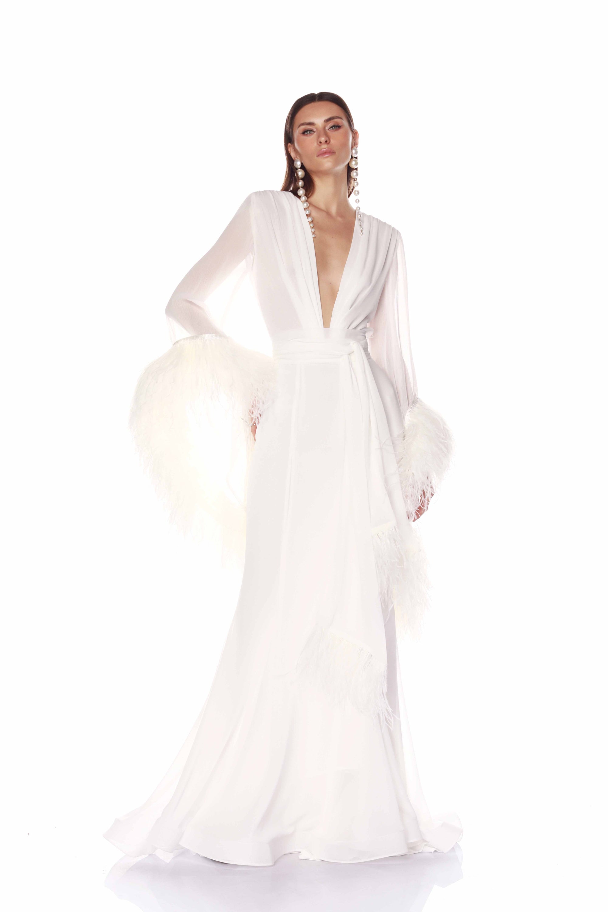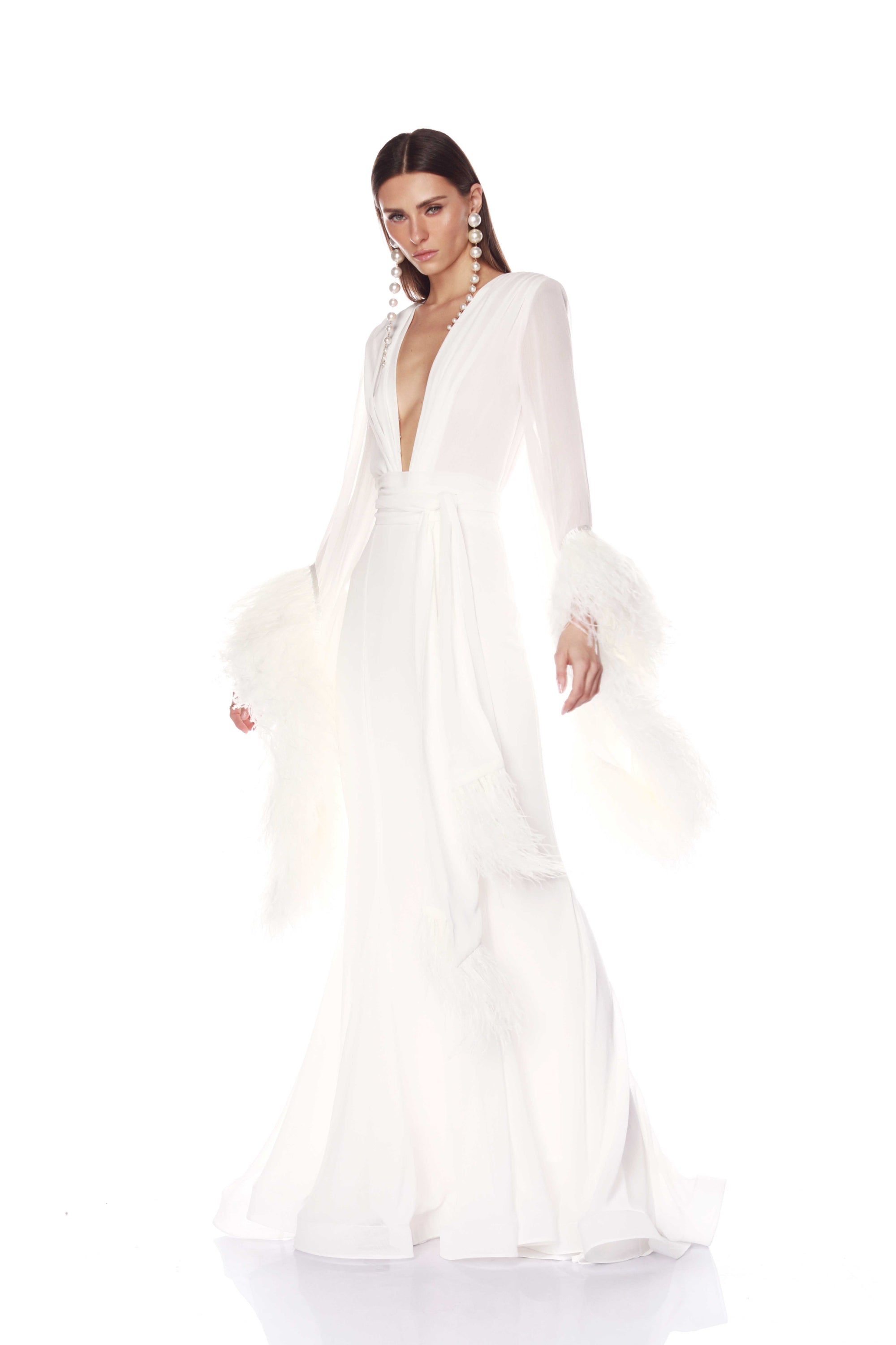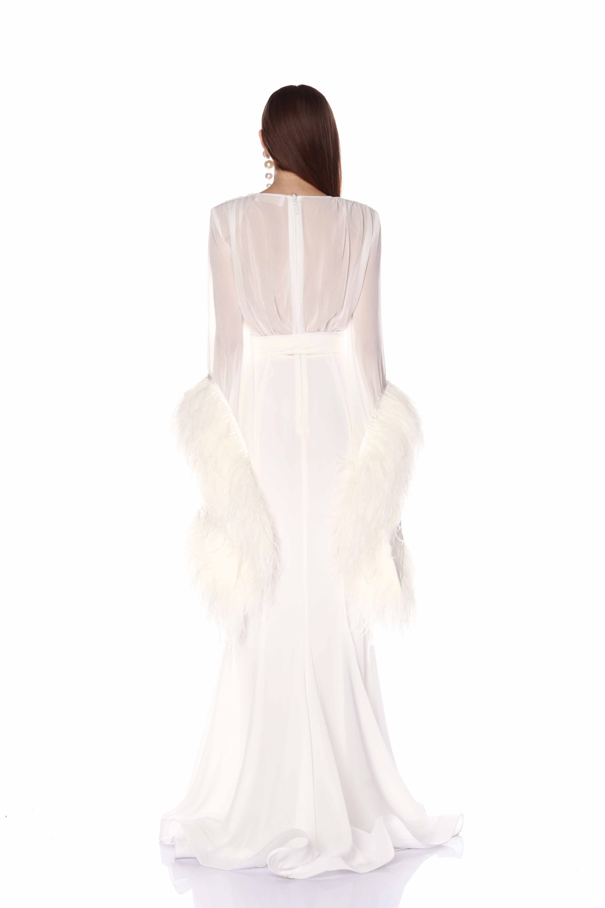 Drape yourself in opulence with our Geisha V-Neck Blanc Gown, adorned with luxurious ostrich feather.