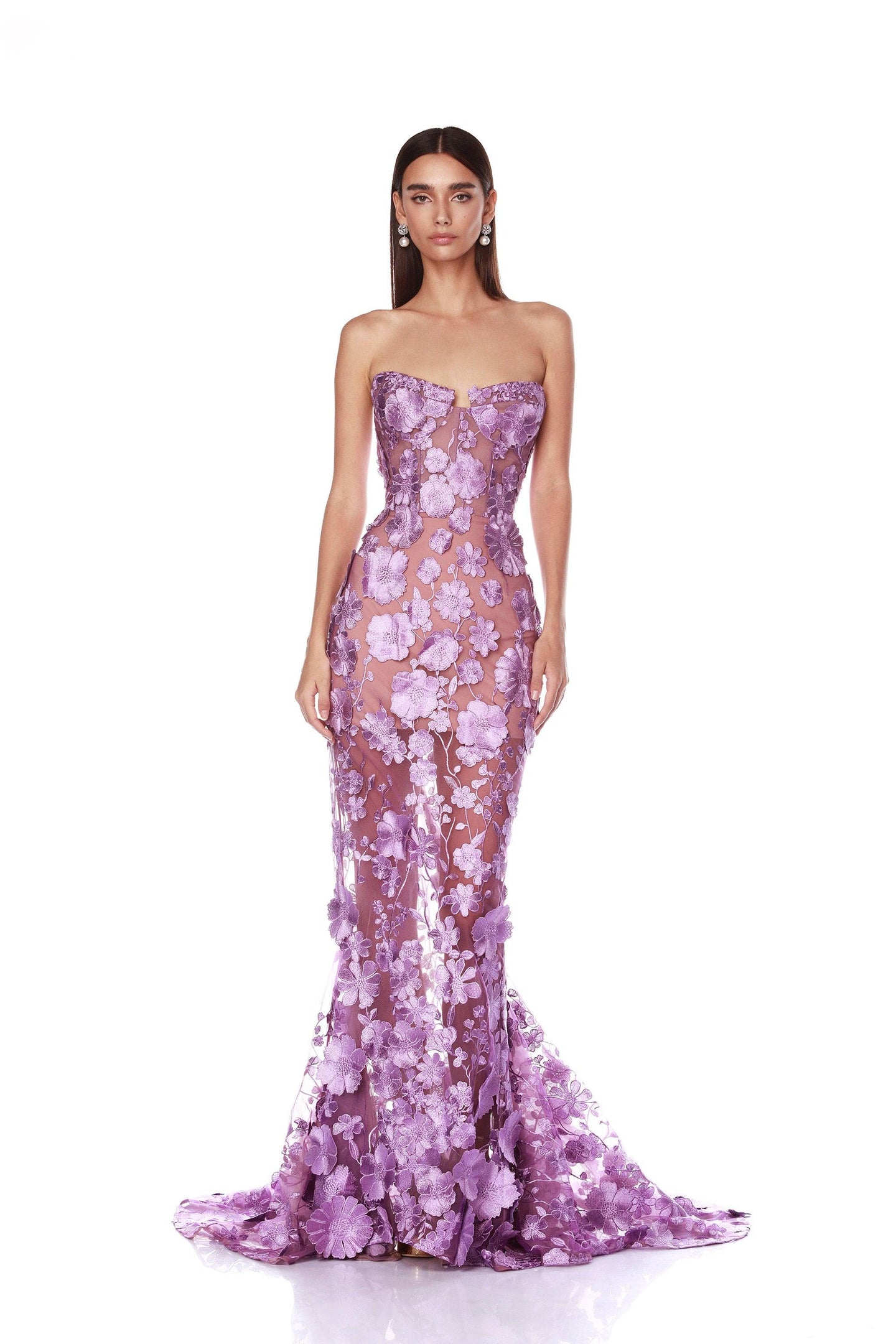 Experience timeless elegance with our Jasmine Lilac Gown, boasting a sweetheart neckline adorned with delicate floral appliqués.