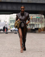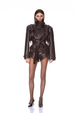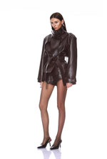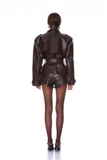 Vegan Croc Embossed Belted Jacket in Dark Brown + Asymmetrical Lace Maxi Skirt