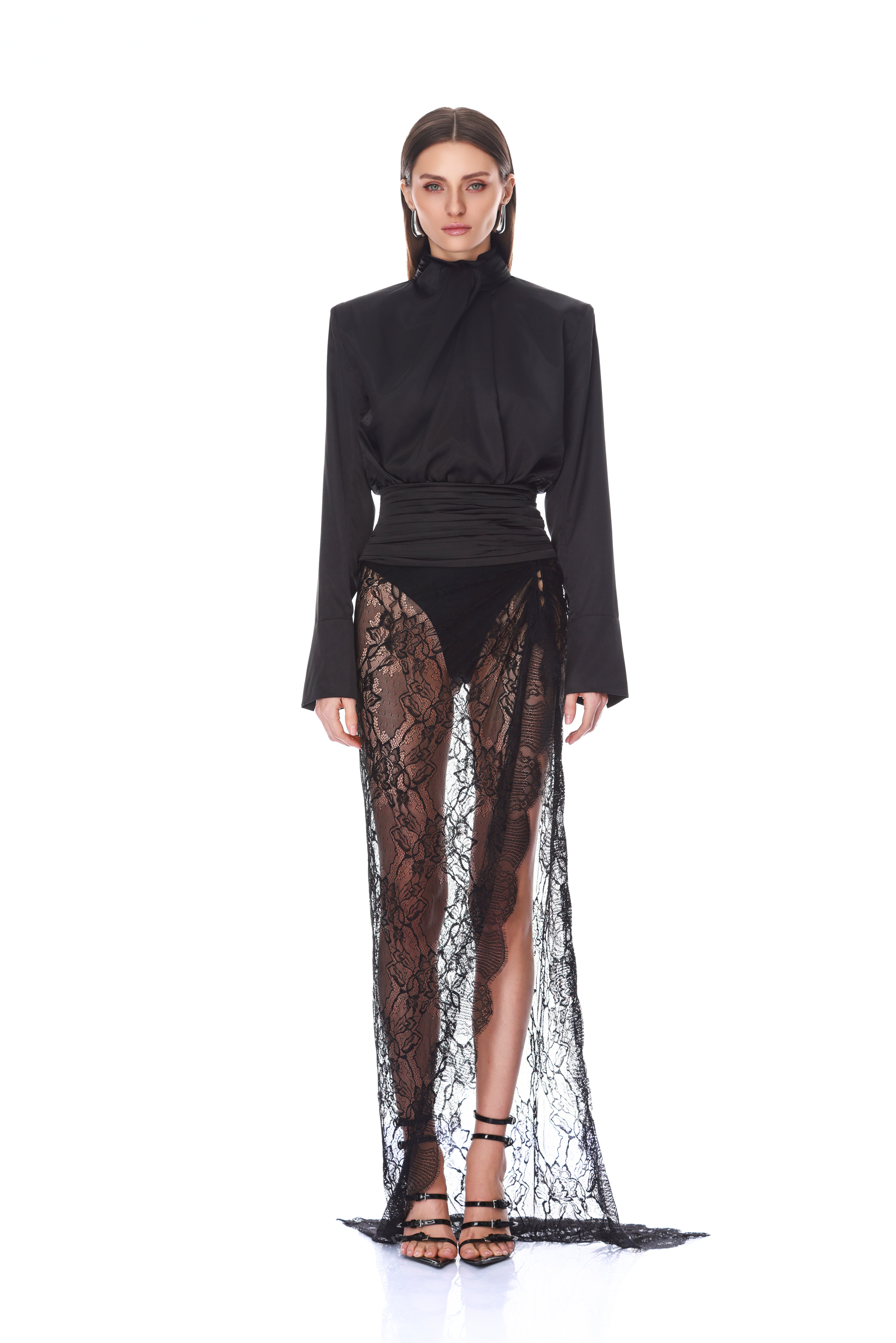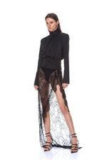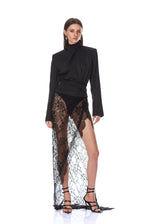 Asymmetrical Lace Maxi Skirt Look 2: Vegan Croc Embossed Belted Jacket + Asymmetrical Lace Maxi Skirt