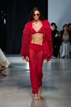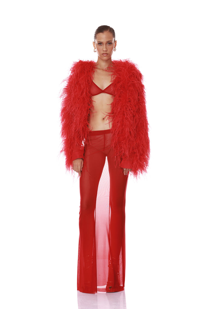 Wrap yourself in statement luxury with our Marlowe Ruby Feather Bomber Jacket — a high‑impact layering piece that brings texture and drama to any ensemble.