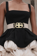 The Raffia Belt is a bold accessory featuring a wide waistband adorned with the BB logo, ensuring a statement look.